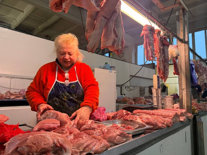 "Впала ціна на 10 гривень, а то для людини вигідно, якщо бере 3-4 кілограми, то вже є пачка масла. Ціна от на ребра таке — 220-200 грн, шия така зачищена — 250, от така, що має лопаточку — 200-220", — говорить продавчиня.