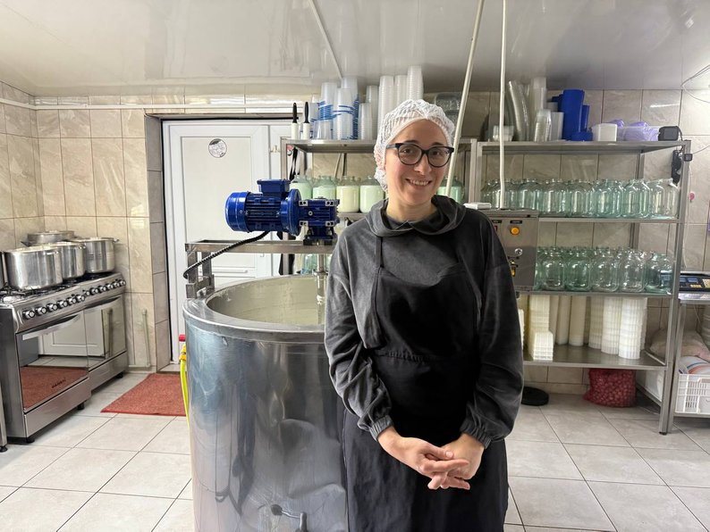 "Тут ми варимо, тут в нас стоїть така сироварня, котел на 300 літрів, і, відповідно, тут проходить процес пастеризації, охолодження, є автоматика і варимо різну лінійку", — говорить співзасновниця ферми Іванна Кемпа.