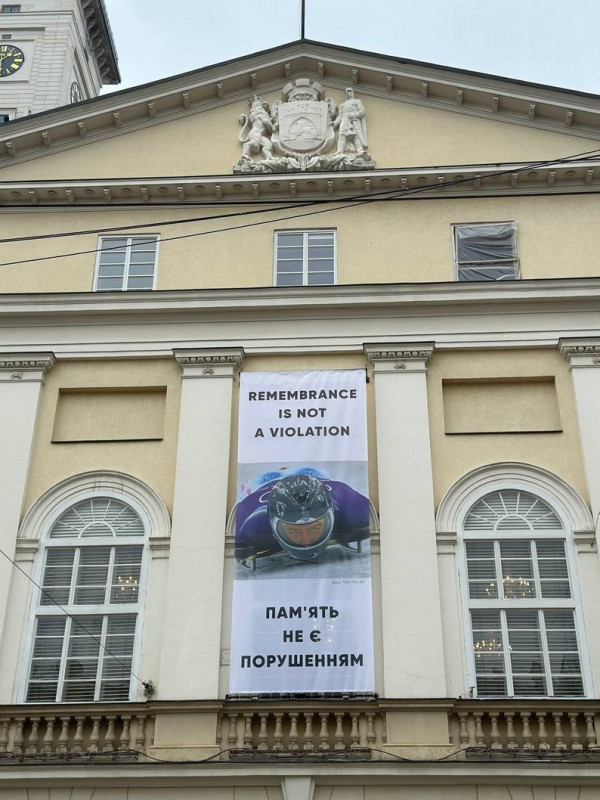 У Львові на фасаді будівлі міської ради 13 лютого вивісили банер із фотографією українського скелетоніста Владислава Гераскевича та написом "Пам’ять не є порушенням".