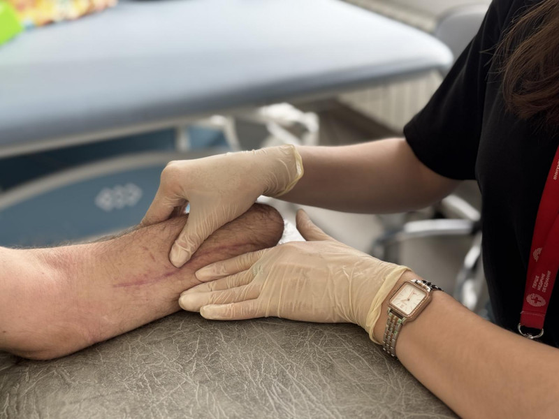 До Львова, у центр "Незламні", пацієнт прибув усе ще з відкритою раною та VAC-апаратомВАК-апарат (Vacuum Assisted Closure) — це медичний пристрій для лікування складних, гострих та хронічних ран шляхом створення контрольованого негативного тиску. Він відкачує ексудат, покращує кровообіг, зменшує набряк та прискорює ріст здорових тканин, значно скорочуючи час загоєння. на лівій руці. Спершу хірурги виконали реампутацію та сформували куксу для подальшого протезування. Згодом фізичні терапевти почали працювати над менеджментом рубця та збільшенням амплітуди рухів у ліктьовому суглобі пацієнта.