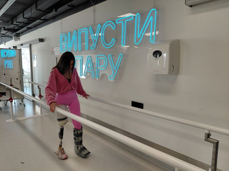 Ольга Долга вчиться ходити з протезом. Суспільне Львів/Ольга Іващук"Почався етап протезування. Я в залі займаюсь на протезі. Прогрес іде з кожним днем і я дуже цьому рада. У перші дні після поранення я не знала, як мені жити з цим. Я не вірила, що можна побудувати щасливе життя без ноги на протезі. Але коли я потрапила сюди, в "Superhumans", я побачила приклади і мені це дуже допомогло", – каже Ольга.