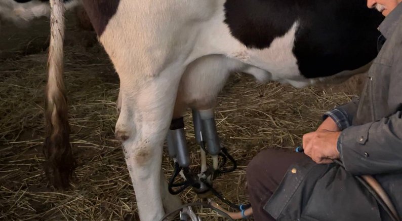 Чоловік за допомогою пристрою доїть корову. Суспільне Львів