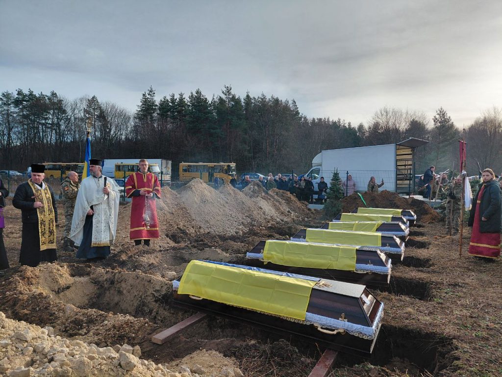 Сьогодні, 16 грудня, у Львівській області відбулося перше поховання невпізнаних тіл загиблих українських військовослужбовців. Шістьох Захисників поховали на новому кладовищі в Івано-Франківській громаді. Панахиду провели у Церкві Святого князя Володимира, до спільної молитви долучилися жителі громади, духовенство та представники влади.