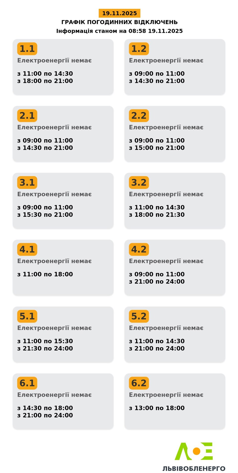 - сайт «Львівобленерго» у розділі «Чому немає світла», де можна переглянути графік відключень за адресою.