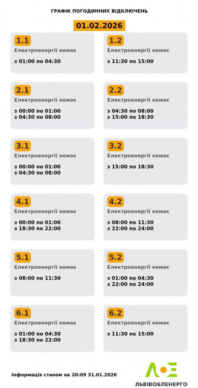 Графіки погодинного відключення електроенергії на 1 лютого. Пресслужба Львівобленерго