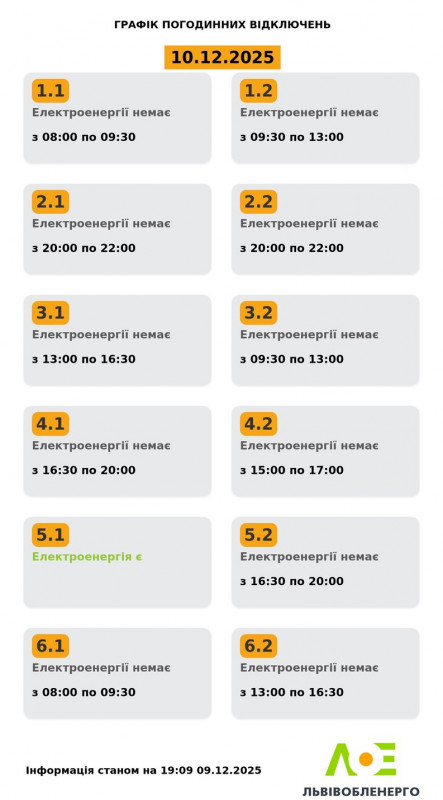 У середу, 10 грудня, на Львівщині будуть діяти графіки погодинного відключення електроенергії.