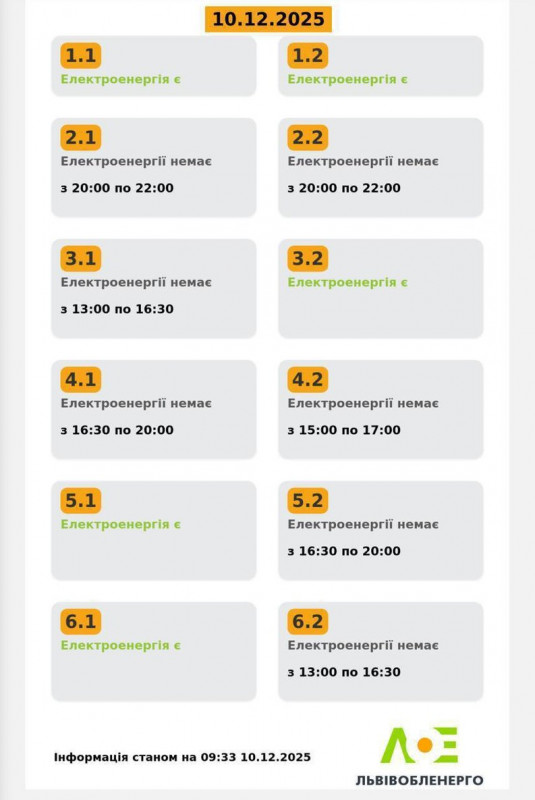 Графік відключення електроенергії для мешканців Львівщини на 10 грудня. Львівобленерго