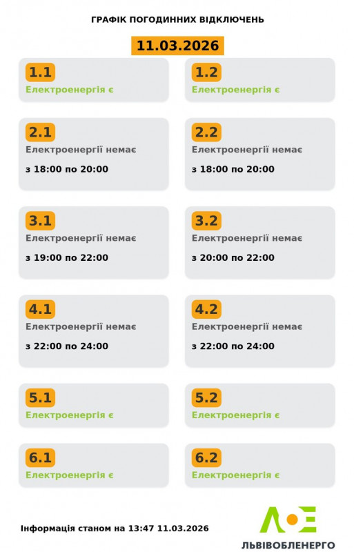Графік відключення електроенергії для мешканців Львівщини на 11 березня. Львівобленерго