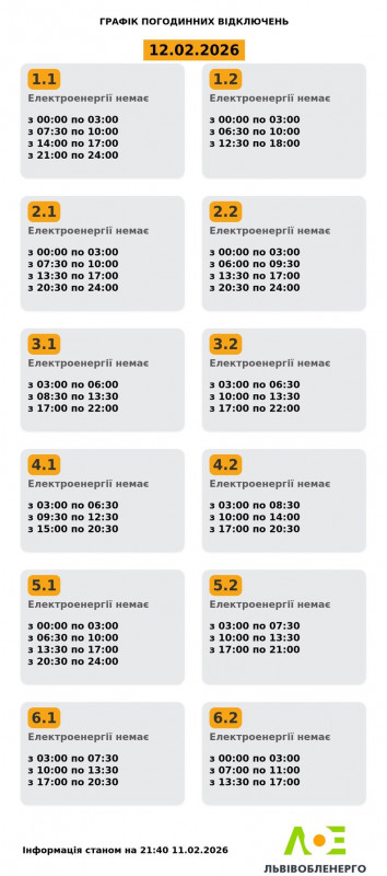 Графіки вимкнень електроенергії на 12 лютого. Львівобленерго