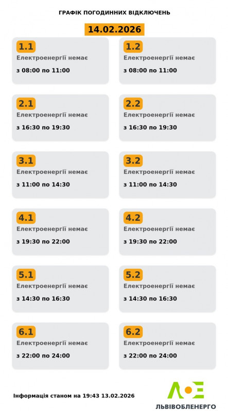 Графік відключення на 14 лютого. Львівобленерго