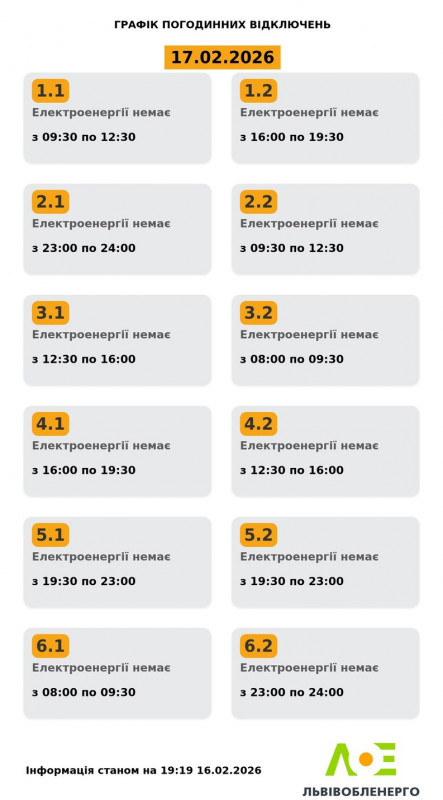 У вівторок, 17 лютого, на Львівщині будуть діяти графіки погодинного відключення електроенергії.