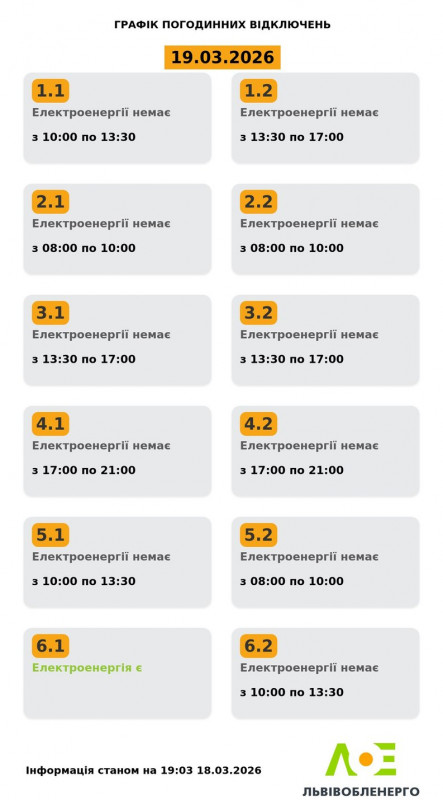 У четвер, 19 березня, на Львівщині будуть діяти графіки погодинного відключення електроенергії.