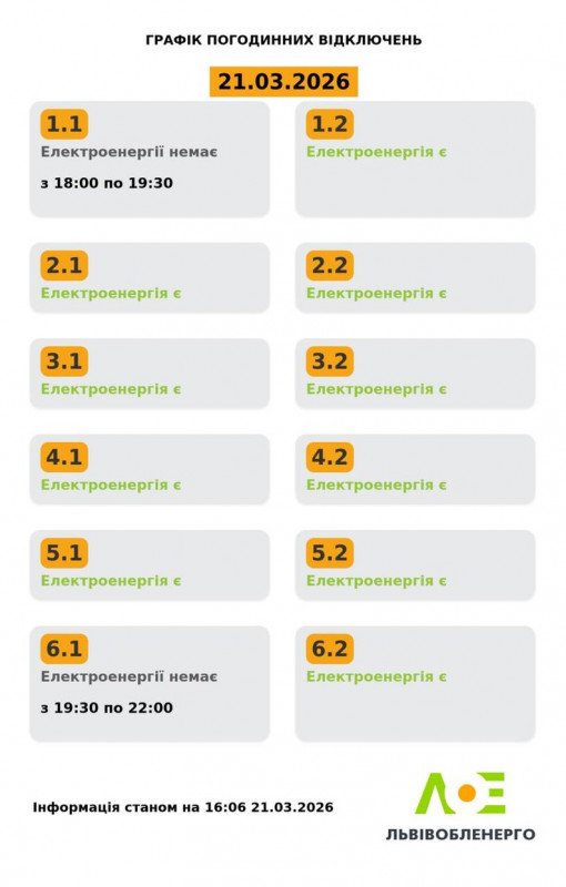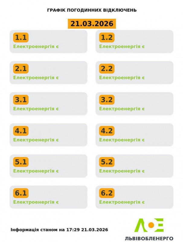 У суботу, 21 березня, на Львівщині будуть діяти графіки погодинного відключення електроенергії.