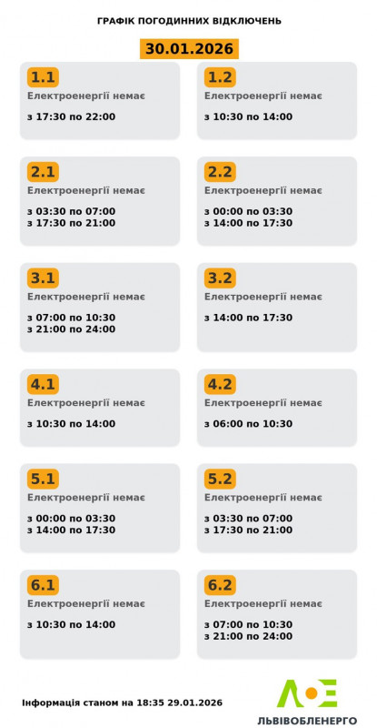Графік вимкнення електроенергії на Львівщині на 30 січня. Львівобленерго