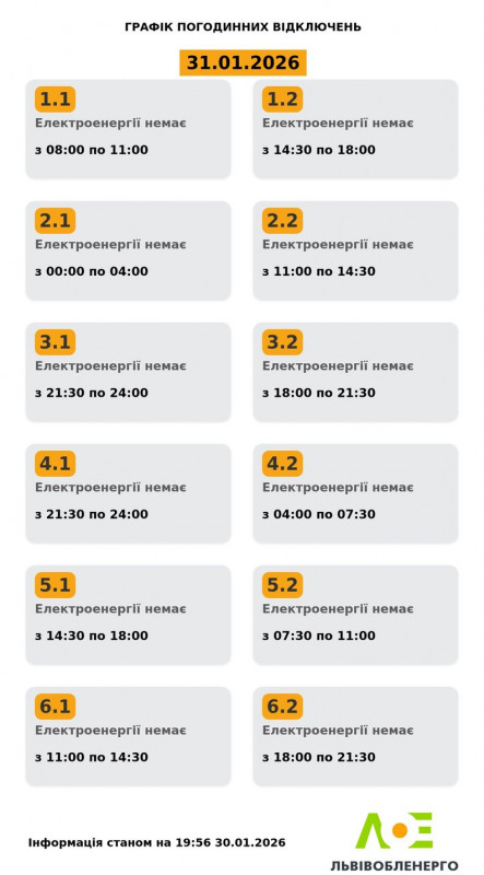 Графік вимкнення електроенергії на Львівщині на 31 січня. Львівобленерго