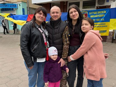 На виставку також прийшов житель Сокаля Руслан Дробот з родиною. Чоловік повернувся з полону у березні 2026 року. Два роки він брав участь в найважчих боях у складі 53 окремої механізованої бригади. У липні 2024 року потрапив у полон. На нього чекали дружина Богдана, троє донечок та батьки.