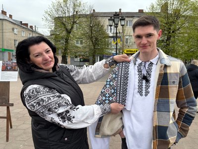 Його мама Оксана показала один з орнаментів вишивки "безконечник", який вона перенесла на сорочку свого сина та вишила на рушнику сокальського осередку.