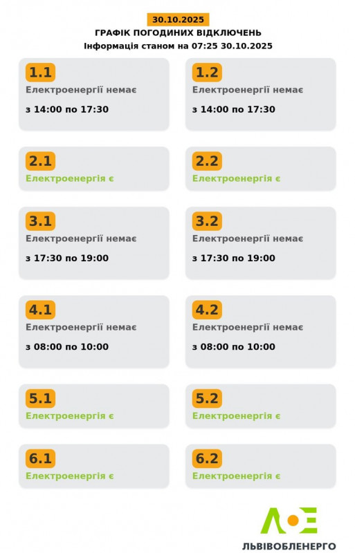 Графік погодинних відключень розділений на шість черг, кожна з яких поділена на дві підчерги. Їх у "Львівобленерго" позначають так: 1.1, 1.2, 2.1, 2.2, 3.1, 3.2, 4.1, 4,2, 5.1, 5.2, 6.1, 6.2.