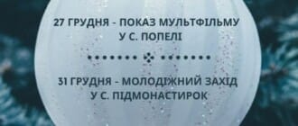 Показ мультфільму у Попелях та молодіжний захід у Підмонастирку Завтра, 27 грудня, о 15:00 у с. Попелі у приміщенні Народного дому відбудеться показНовини Борислава