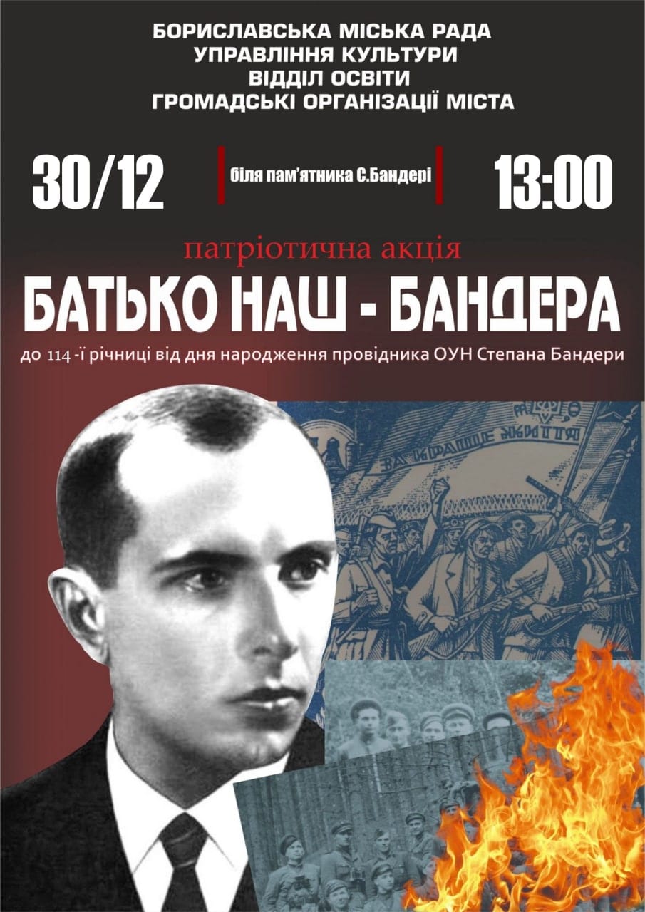 Тож у п’ятницю, 30 грудня, о 13:00 у Бориславі біля пам’ятника Степану Бандері відбудеться патріотична акція “Батько наш — Бандера”.