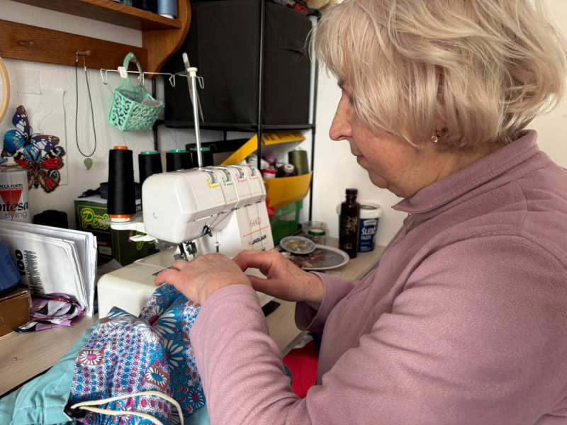67-річна переселенка із Сіверськодонецька Валентина Тулинцева, яка через війну переїхала на Львівщину, шиє в гуртожитку адаптивний одяг для поранених військових. Швейні машинки надали волонтери, на фурнітуру донатить з пенсії, та удосконалює викрійки з інтернету.