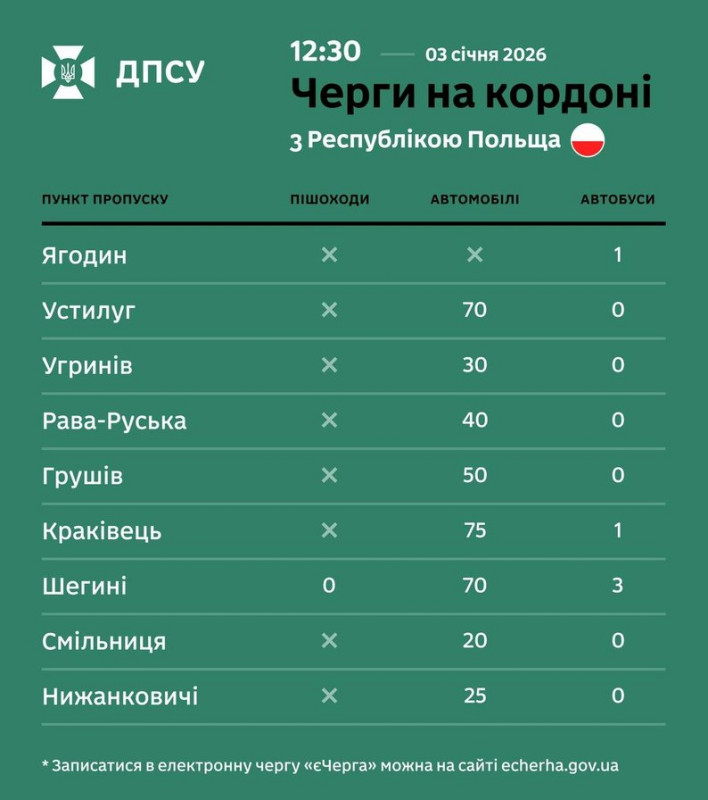 "Звертаємо увагу, що для автобусних перевезень діє система єЧерга, яка дозволяє перевізникам самостійно планувати час перетину кордону. Проте в пунктах пропуску "Шегині" та "Краківець" слотування ще не запроваджене. Це створює додаткове навантаження, адже автобуси прибувають без визначеного часу оформлення", — йдеться у повідомленні.
