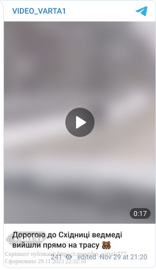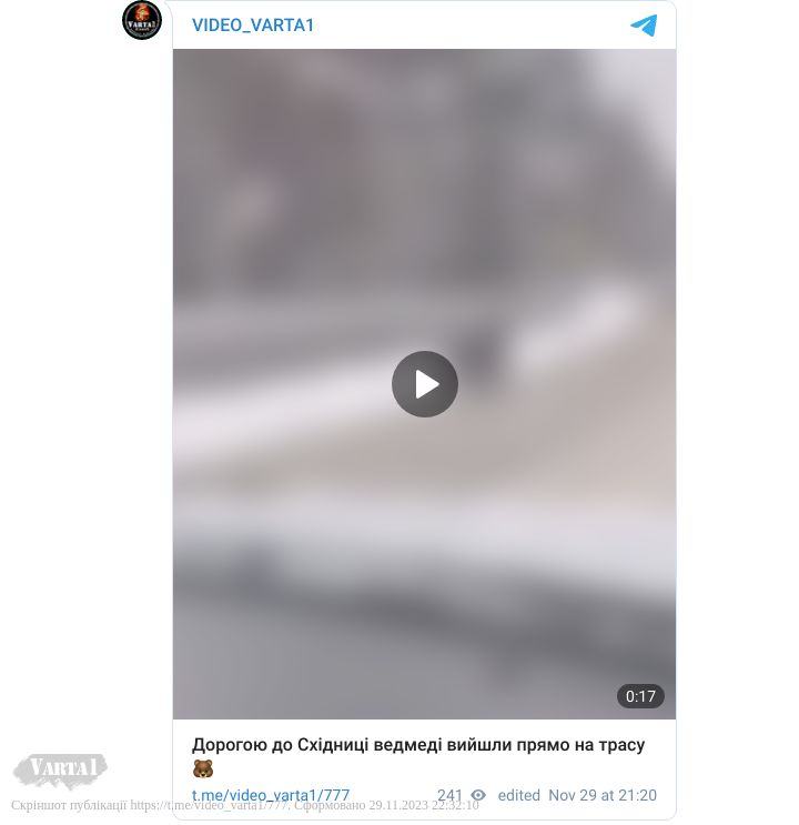 Сьогодні, 29 листопада, у пабліках шириться відео, на якому зафіксовано, як кілька бурих ведмедів вибігли на автодорогу.