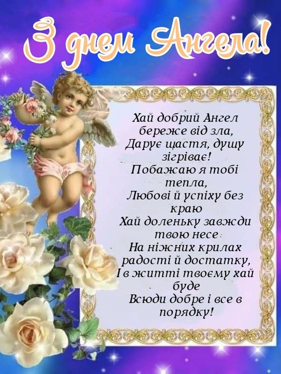 Вітаю тебе з Днем ангела! Бажаю, щоб ангел завжди тебе оберігав і допомагав в усіх твоїх справах: домашніх і робочих. Щоб всі твої починання були втілені в життя, щоб завжди супроводжували успіх і процвітання.