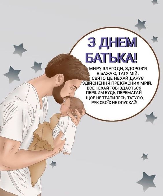 Вітаю з Днем батька! Бажаю завжди залишатися прикладом сміливості, мудрості, впевненості і сили. Бути батьком — справа складна, бажаю справлятися з нею на всі двісті відсотків!
