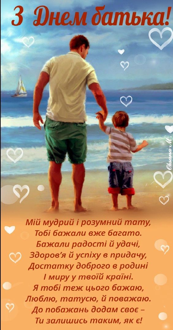 Милий тато, в це чудове свято – День батька – і будь-який інший день я тобі щиро бажаю радости серця, життєвих сил і простого життєвого щастя. Будь завжди молодий душею, міцний здоров’ям і сповнений енергії та бадьорості. Ти – мій головний приклад для наслідування, і я хочу, щоб ти завжди був поруч ,ЛЮБЛЮ ТЕБЕ,