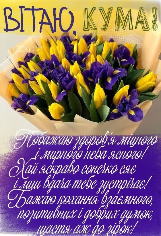 Куме, в день твого народження я бажаю тобі злагоди та любові, сімейного затишку, великого кохання та любові від рідних. Хай все в тебе буде добре в будь-якому місті та за будь-яких обставин. Хай ніколи не приходять до твого серця печаль та смуток. Насолоджуйся життям, радій, посміхайся і частіше заходь в гості.