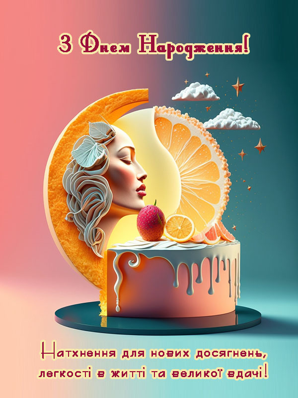 Вітаю з цим чудовим святом – з Днем народження! Бажаю щирих посмішок, благополуччя в родині, міцного здоров’я, безмежної радості і успіхів у всіх твоїх справах. Нехай твоя душа випромінює красу, а очі сяють щастям. Нехай тебе обожнюють і кохають завжди. Отримуй підтримку від друзів і рідних, насолоджуйся позитивними емоціями, приємними моментами і сонячними днями!