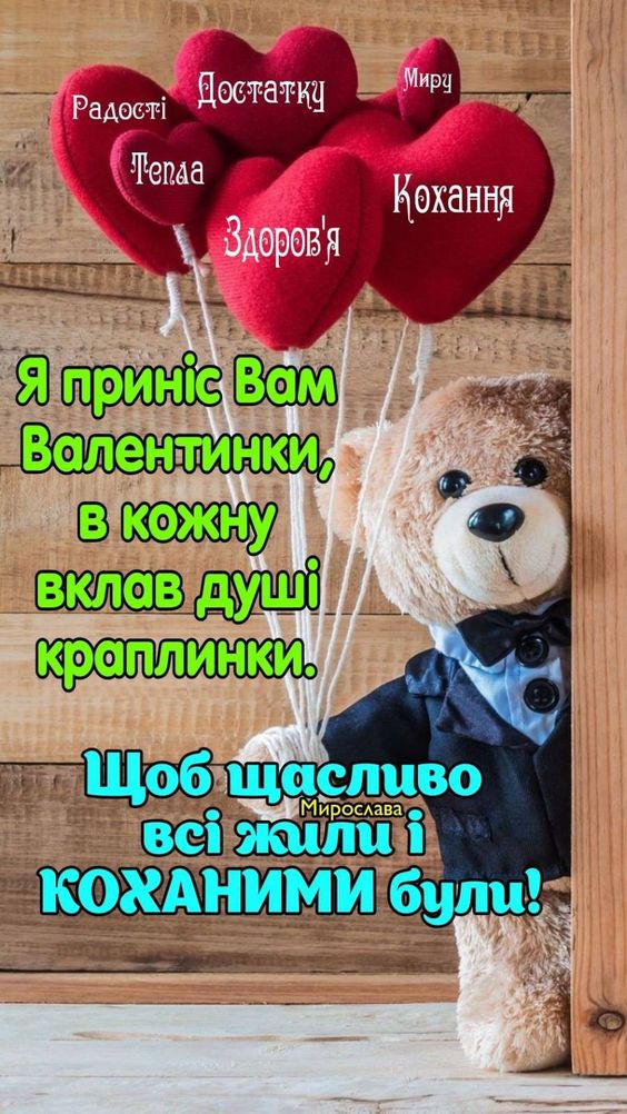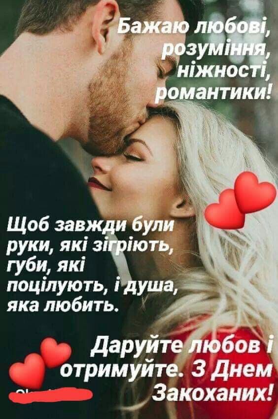 У День святого Валентина хочу побажати завжди відчувати тепло рідного серця і радість у міцних обіймах близьких людей. Нехай любов панує у твоєму житті, випромінюючи щастя та удачу в сім’ї, на роботі, вдома і на вулиці.