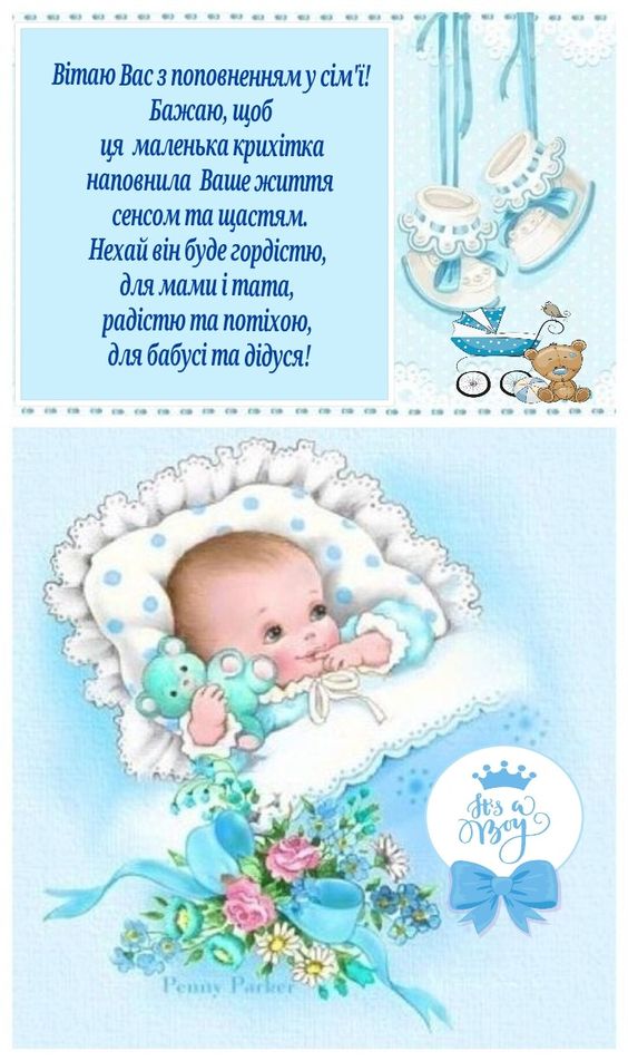 З народженням синочка! Нехай ваш хлопчик має богатирське здоров’я та веселу вдачу! Нехай росте красивим та кмітливим, добрим та чесним. Хай у нього буде багато друзів та цікавих занять. Бережіть своє сонечко, радійте йому, навчайте мудрим речам!