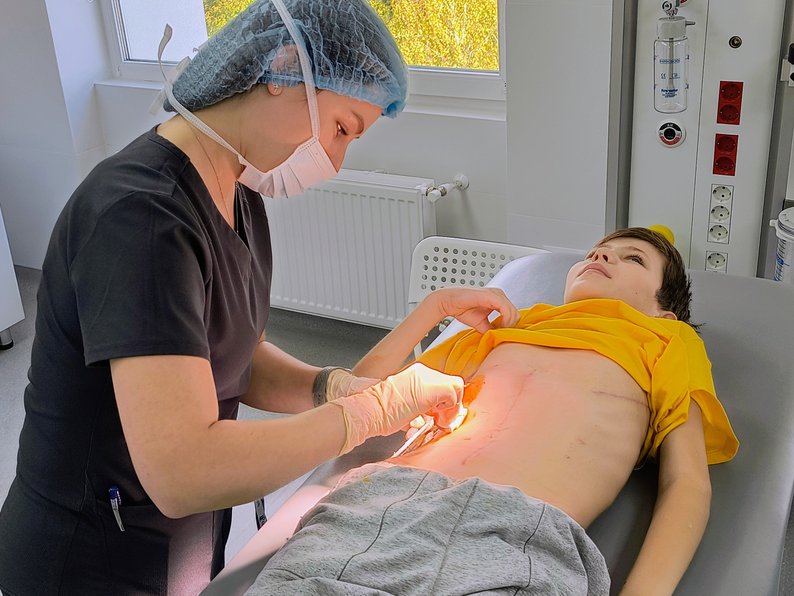 Обстеження 10-річного пацієнта. Facebook/дитяча лікарня святого Миколая"Дитина приїхала до нас у вкрай важкому стані. У нього був травматичний розрив печінки 5-го найвищого ступеня, велика кровотеча і геморагічний шок. Дитину відразу підняли в операційну. Спочатку ми знекровили всю черевну порожнину шляхом перетискання аорти, а далі в нас було 40 хвилин, щоб знайти джерело кровотечі і ліквідувати його. Ми знайшли розрив лівої гілки портальної вени і ушили її разом з паренхімою печінки", — повідомив медичний директор лікарні святого Миколая Першого медоб’єднання Львова Олександр Калінчук.
