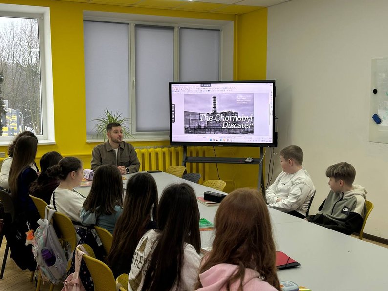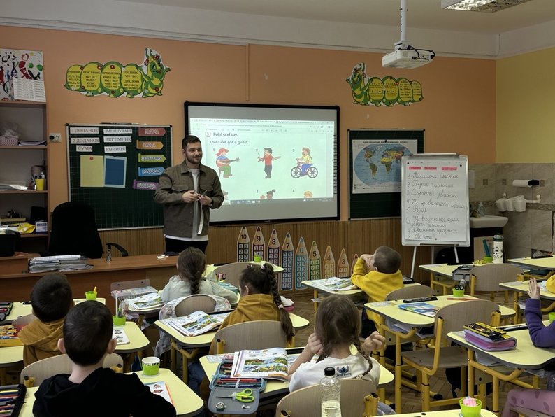 Віктор Демко проводить урок англійської для молодших дітей. Суспільне Львів/Ірина Грицан