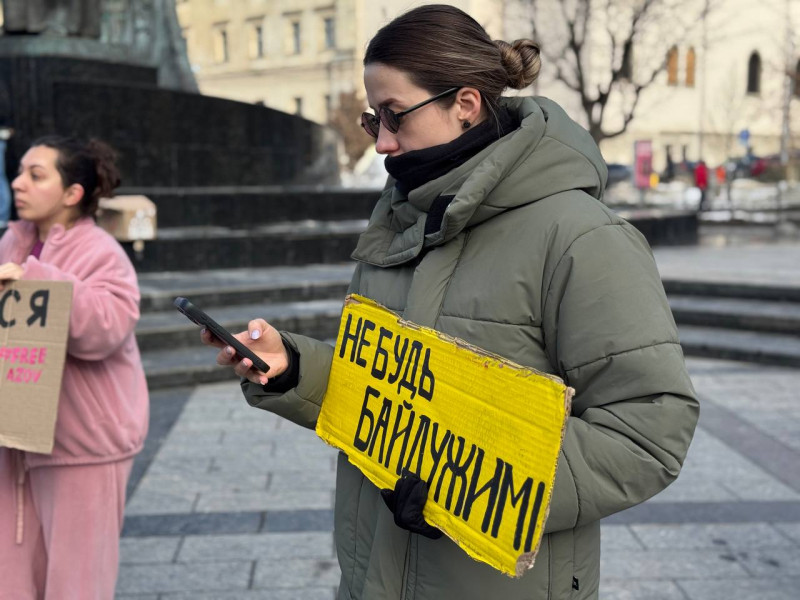 Ольга Смічик каже, що вона прийшла на акцію, аби висловити підтримку всім, адже на заході мають бути не лише військові та родини військовополонених, а — усі.