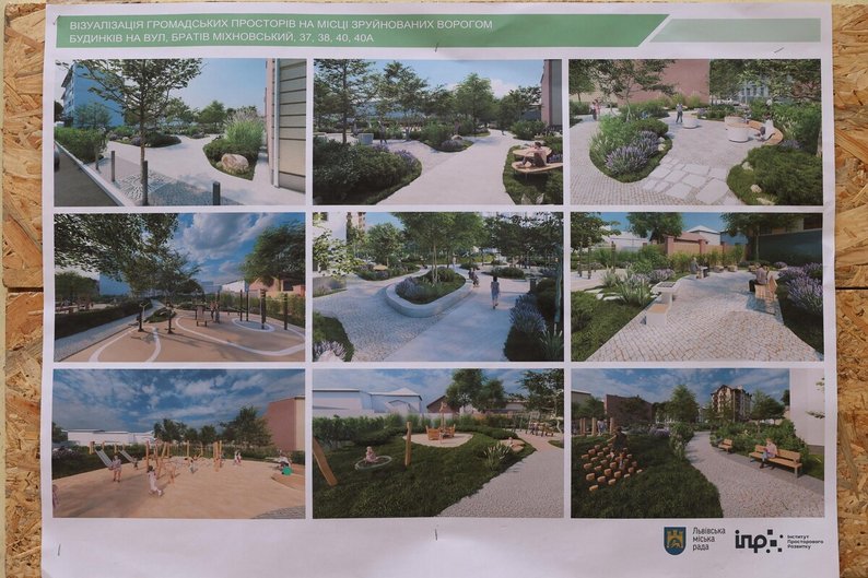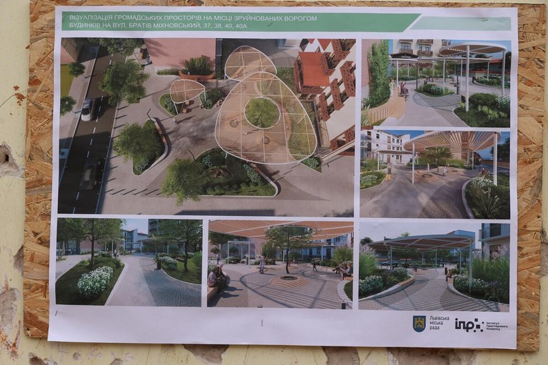 У Львові, на місці зруйнованих внаслідок обстрілу житлових будинків на вул. Братів Міхновських, 37, 38, 40, 40а, облаштують громадський простір з ігровими та спортивними зонами, зонами для відпочинку, зеленими насадженнями та вуличними меблями. Для цього усім територіям, на яких були розміщені будинки, нададуть статус скверів.