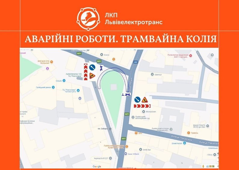 Схема. Пресслужба Львівської міської ради"Найскладніші роботи ми традиційно проводимо вночі, щоб не змінювати рух трамваїв за затвердженими маршрутами. Проте просимо усіх учасників руху зважати на дорожню ситуацію під час проведення ремонту. Просимо водіїв бути максимально уважними з 17 по 22 листопада на площі Соборній та радимо обирати безпечну швидкість, а за можливості – оминати цю ділянку", – повідомили у ЛКП "Львівелектротранс".