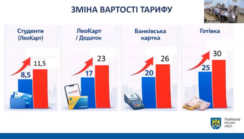 Вартість проїзду за студентської картки зросте з 8.50 грн до 11.50 грн, вартість за Леокартом з 17 грн до 23 грн, вартість оплати банківською карткою з 20 грн до 26 грн та готівкою з 25 грн до 30 грн.