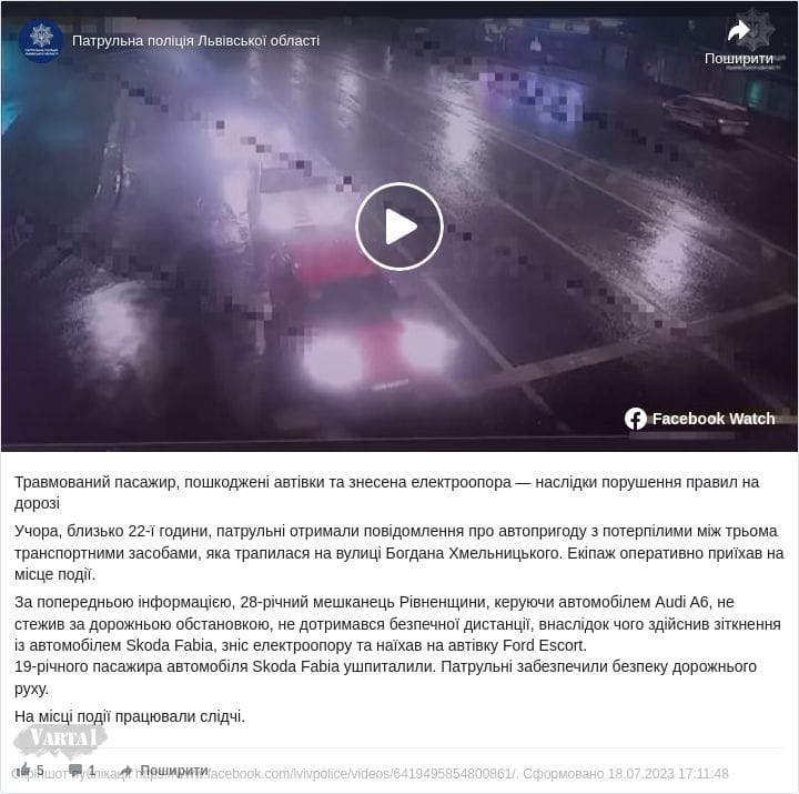 За попередньою інформацією, 28-річний мешканець Рівненщини, керуючи автомобілем Audi A6, не стежив за дорожньою обстановкою, не дотримався безпечної дистанції, внаслідок чого здійснив зіткнення із автомобілем Skoda Fabia, зніс електроопору та наїхав на автівку Ford Escort.